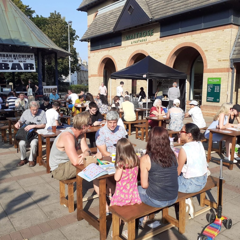 Does the picture show people relaxing in a southern European country? No, absolutely not, it is atypical Sunday on the Barnet Market site! There is our great local brewer, Urban Alchemy, serving draft beer from the bandstand with streetfood stalls dotted around. Regulars include Yamama’s falafels, Jamaican food, delicious chicken, scrumptious desserts and more. It is true that the above picture shows a Sunday in summer, but the hope is to extend the Sunday Markets throughout the year. If you are a trader and interested in bringing a stall, please go to our Contact page. If you thirsty and/or hungry, you can check if the Sunday Market is taking place by visiting: https://www.thespiresbarnet.co.uk/
